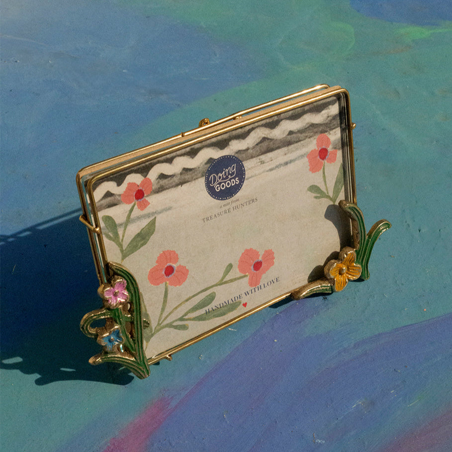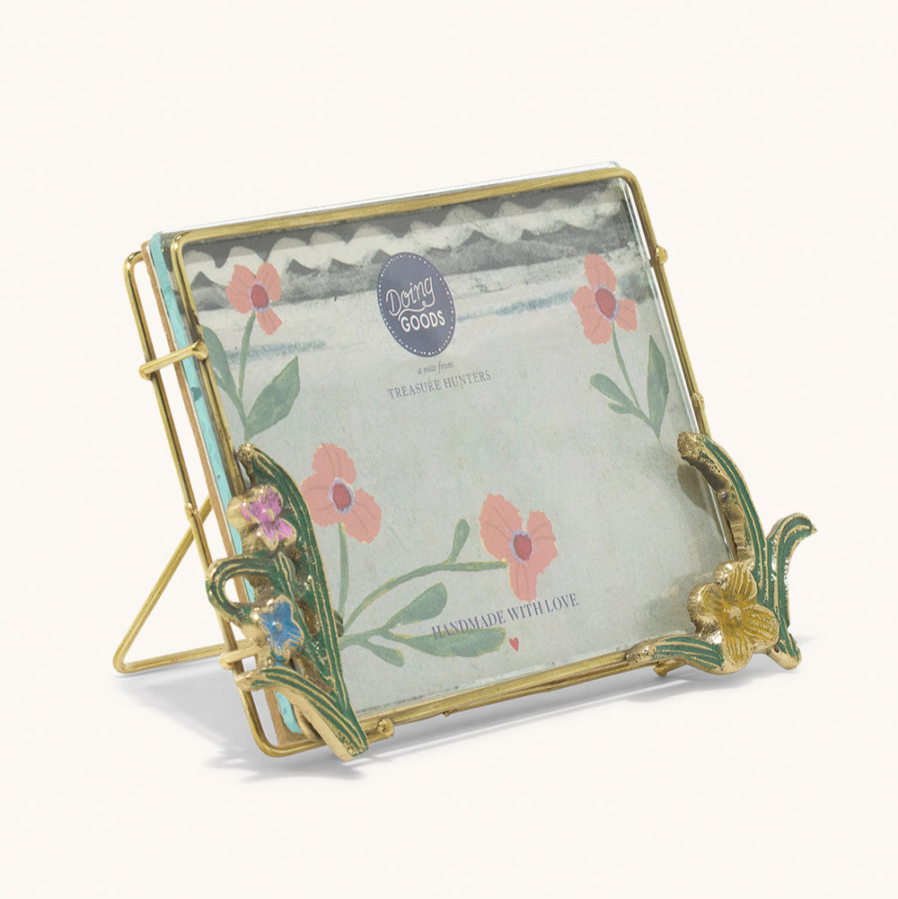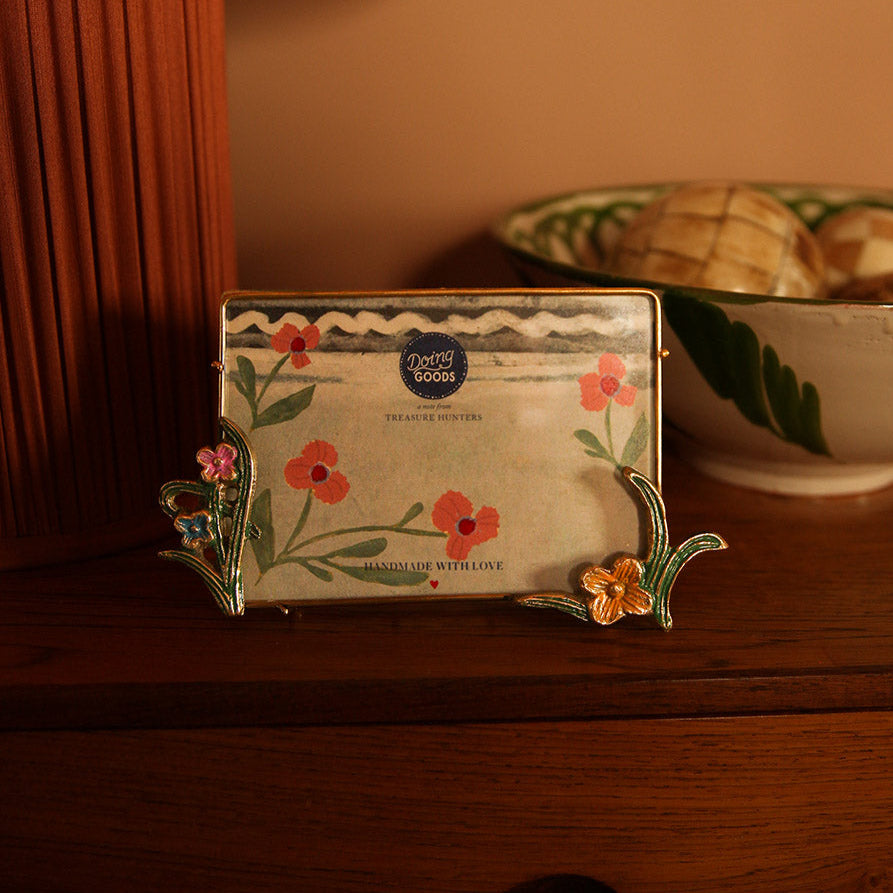 Ajoutez une touche romantique et florale à votre intérieur avec ce cadre photo en laiton doré, délicatement incrusté de fleurs aux tons roses, bleus et jaunes. Véritable écrin pour vos plus beaux souvenirs, il allie raffinement artisanal et douceur naturelle. À poser sur un bureau, une étagère ou dans le salon, ce petit cadre doré attire le regard et devient un point focal plein de charme dans votre décoration.