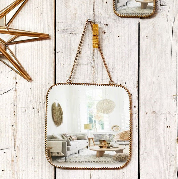 Joli miroir carré à suspendre grâce à une chaine en laiton. Il s'harmonisera merveilleusement avec d'autres miroirs de la même gamme.