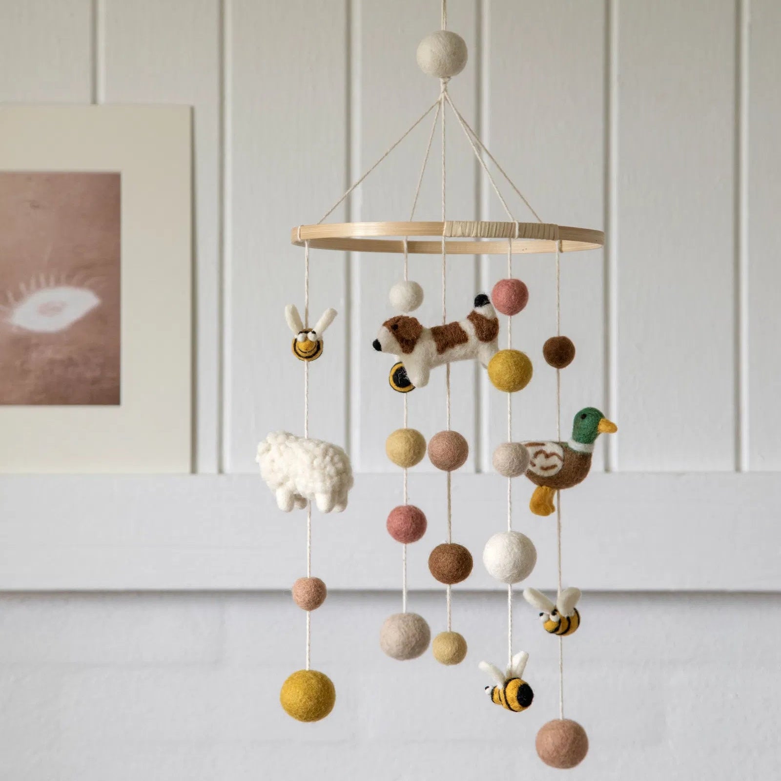 Ce mobile à suspendre met en scène de petits animaux en laine feutrée – chien, mouton, canard, abeilles… – pour créer un univers tendre et apaisant autour du berceau. Avec ses formes douces et son mouvement léger, il accompagne bébé vers le sommeil et l’invite à voyager au pays des rêves, en toute sérénité.